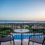 The 9-room Trapezaki Garden Villas Mousata entices guests to enjoy hiking and bike riding and is located 3.5 km from such natural sites as Lourdas Pebble Beach. At this Mousata villa, a terrace provides views of the sea as well as a dining table.
